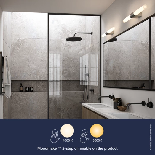 Helva Double er en moderne og minimalistisk væglampe med integreret LED og en 2-step Moodmaker SceneSelect funktion, der kan dæmpe lyset ved en simpel berøring og skifte temperaturen på det smukke og naturlige lys, R90. Da væglampen har en høj beskyttelsesgrad, er denne ideel til brug i fugtige rum, som badeværelset. Moodaker funktionen i form a en stepless touch kontakt kan både dæmpe, tænde/slukke og ændre lysets temperaturen fra varm til kold. En kort berøring giver dig muligheden for at skifte mellem koldt og varmt lys, hvorimod en længere berøring