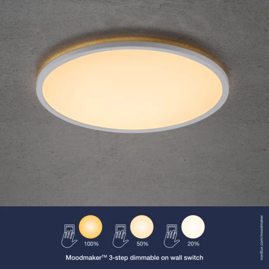 Oja 42 lampe fra Nordlux er fremstillet i hvidt plast og med Moodmaker-funktionalitet, som giver mulighed for at dæmpe lyset på Oja plafond i 3 trin uden en lysdæmper men via vægkontakt. Der medfølger 22 watt LED til denne Oja 42 loftlampe med 2700 Kelvin og 80 RA, hvilket giver et naturligt og behageligt hvidt lys, som er effektfuldt men i den varme tone. Med 25.000 timers levetid har LED pæren i Oja 42 en lang levetid. Denne plafond kan med fordel anvendes som loftslampe i entre eller bryggers.