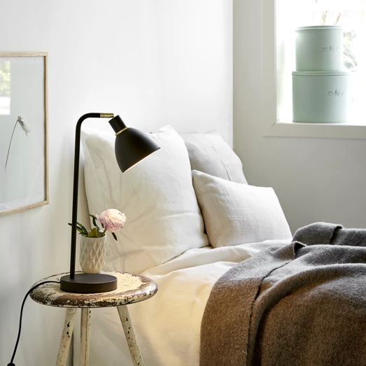 Ray bordlampe fra Nordlux er en bordlampe i et meget klassisk og stilfuldt design. Lampen er fremstillet i sort lakeret stål. Lampen giver et blødt og behagelig lys, der passer ind mange steder i boligen. Brug den som dekorativ lampe i et hjørne, der trænger til lidt ekstra lys, eller brug den som læselampe ved den gode stol eller på natbordet.