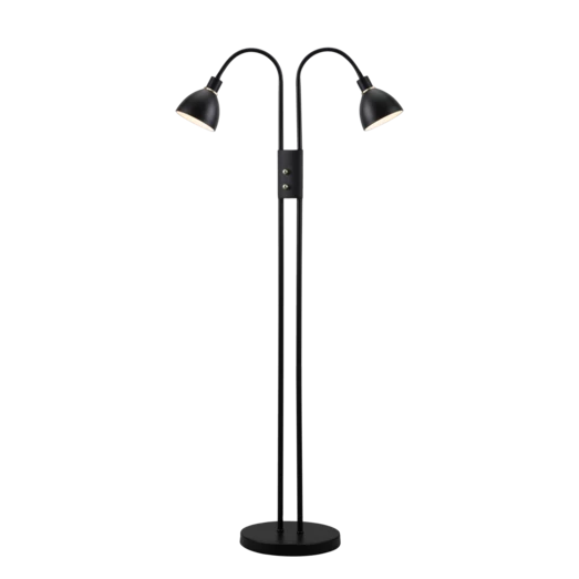 Ray dobbelt gulvlampe med to lysdæmpere fra Nordlux er i et meget klassisk og stilfuldt design. Lampen er fremstillet i sortlakeret metal med aftagelige messing ringe. Brug den som dekorativ lampe i et hjørne, der trænger til lidt ekstra lys, eller brug den som læselampe bag den gode stol. Lampehovederne kan vendes i alle retninger, hvilket giver mange anvendelsesmuligheder.