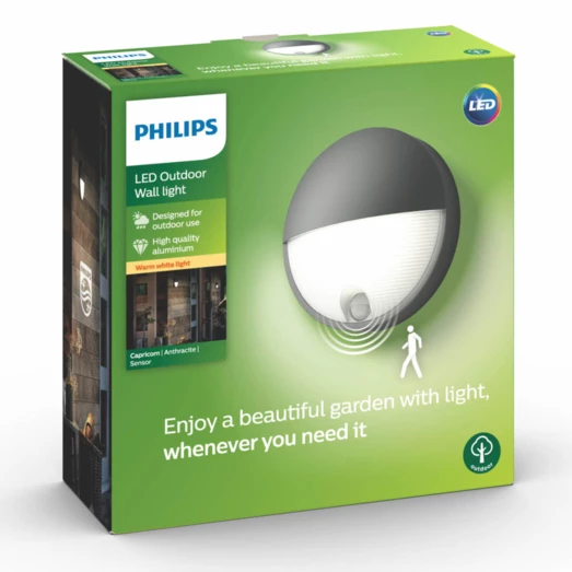 Den antracitfarvet myGarden Capricorn udendørs sensorvæglampe er ideel til dig, der søger en lampe, der kan anvendes i både forhave- og baghave samt ved verandaer og indgangspartier. Fremstillet i slidstærkt aluminium og med LED får du en energivenlig udendørs væglampe. I Philips Capricorn væglampe er der indbygget en smart bevægelsessensor, der tænder og slukker automatisk alt efter om der registreres bevægelse eller ej. Der medfølger en Motion Sensor, som giver dig muligheden for, at få en besked Philips væglampen registrerer bevægelse.