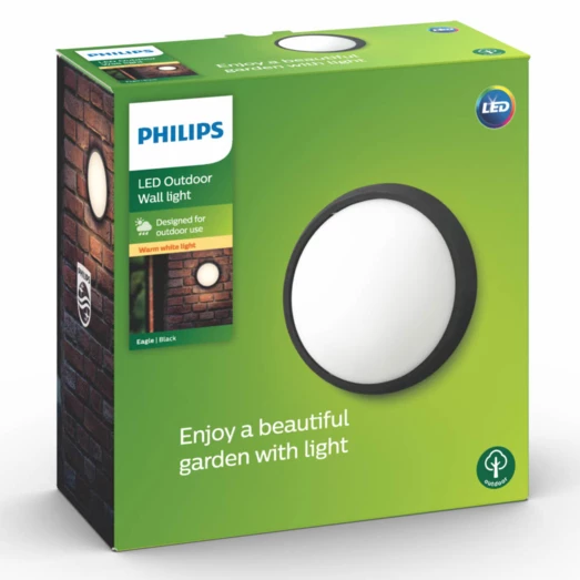Den sorte Eagle udendørs væglampe er ideel til både forhave- og baghave samt veranda og indgangspartier. Hvis du søger en væglampe med kraftfuld belysning, der ikke går på kompromis med design eller funktionalitet, så er Philips Eagle LED væglampe et oplagt valg.