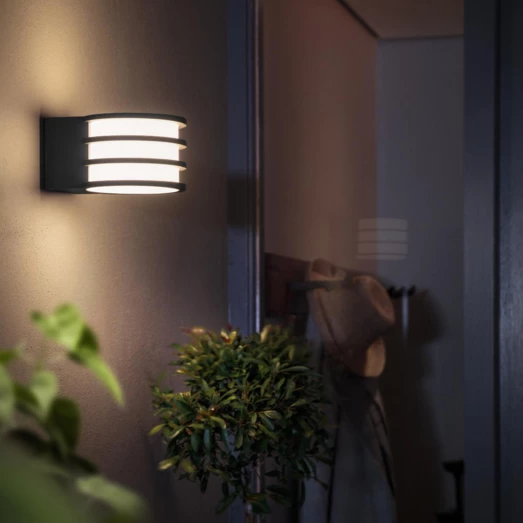 Moderne udendørs væglampe fremstillet i antracitfarvet aluminium med flotte lyseffekter og dæmpbar funktion. Dets specielle udformning gør Philips væglampen ideel til områder som haven, terrassen og nær hoveddøren, hvor der er behov for højt lysudbytte. Denne Philips Hue Lucca væglampe er oplagt, hvis du ønsker at udvide dit eksisterende Philips Hue opsætning med endnu mere intelligent belysning.